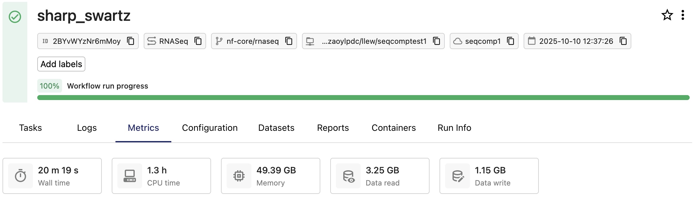 The nf-core/rnaseq pipeline is run on a Seqera Compute environment with a test dataset as input. The following run metrics are recorded at workflow completion: